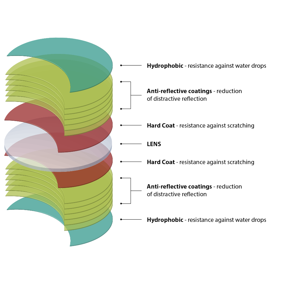 ลดแสงสะท้อนที่เกิดขึ้นบนผิวเลนส์ หลักการคือการทำให้คลื่นเเสงที่มนุษย์มองเห็นผ่านเลนส์สายตาเข้าสู่ดวงตาเราได้อย่างมีคุณภาพมากที่สุด และตัดช่วงคลื่นแสงที่ไม่จำเป็นและที่มีอันตรายทิ้งออกไป ทำให้เรามองเห็นภาพที่ความคมชัด (contrast) ความใสมากขึ้น ลดแสงเงาสะท้อนของแสงที่รบกวนเราให้น้อยลง และทำให้ผู้ที่มองเข้ามาจะเห็นดวงตาของเราได้ชัดเจนไม่เห็นเงาสะท้อน เสริมบุคลิกของผู้สวมใส่ (ตามรูป 1.2)