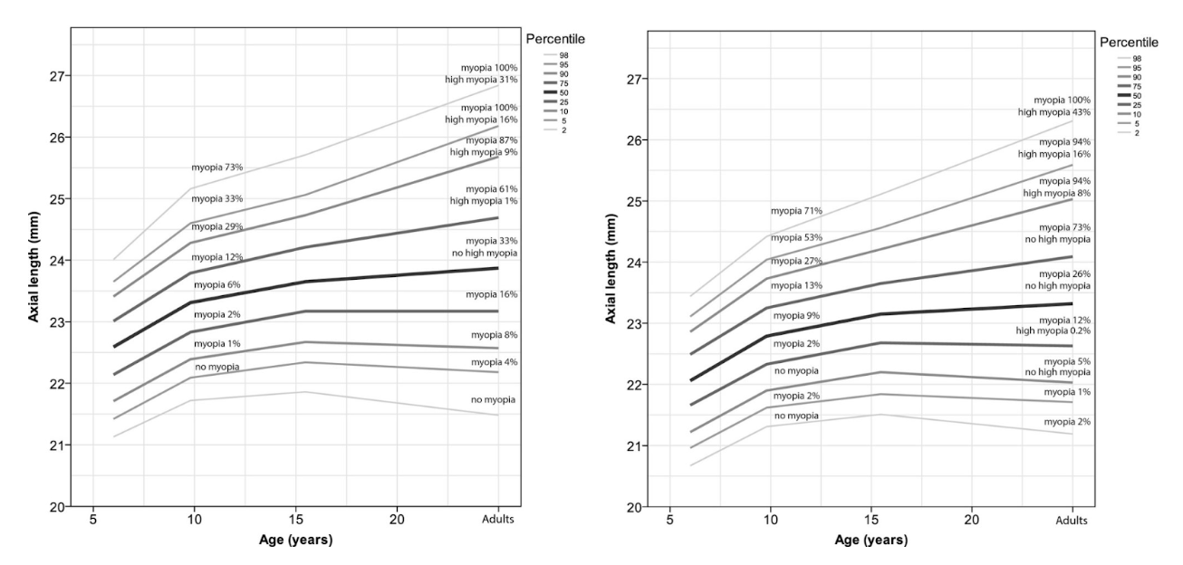 จากการศึกษาค้นพบว่า ขนาดของการเปลี่ยนแปลงความยาวของลูกตา (Axial Length) ที่มากขึ้นส่งผลให้สายตาสั้นมากขึ้น ซึ่งขนาดของกระบอกตาที่ยาวมากจะมีขนาดเพิ่มขึ้นตามอายุ