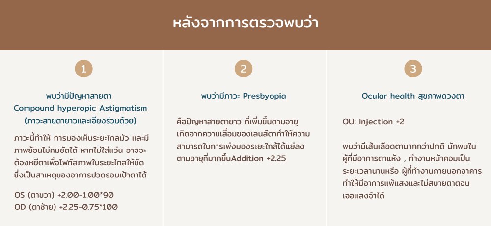 คนไข้หญิง อายุ 59 ปี มีปัญหามองไกล และ ใกล้ไม่ชัด ร่วมกับ มีอาการแพ้แสงสู้แสงไม่ได้ ลักษณะการทำงาน ต้องใช้คอมพิวเตอร์พิมพ์งาน และ มีการเคลื่อนไหว ลุกนั่ง เดิน ในที่ทำงานตลอดวัน จึงต้องการใส่แว่นตัวเดียวให้ มองได้ทุกระยะ โดยไม่ต้องเปลี่ยนแว่นไปมา