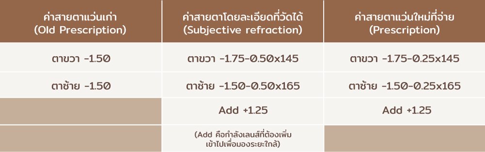 จากผลการตรวจวัดสายตาพบว่า ลูกค้าท่านนี้มีสายตาสั้นและสายเอียงที่ระยะไกล และยังมี สายตายาวตามวัยที่ระยะใกล้ ทำให้เมื่อมองไกลต้องใส่แว่นสายตาสั้น แต่เมื่อมองใกล้ต้องถอดแว่นจึงจะมองเห็น