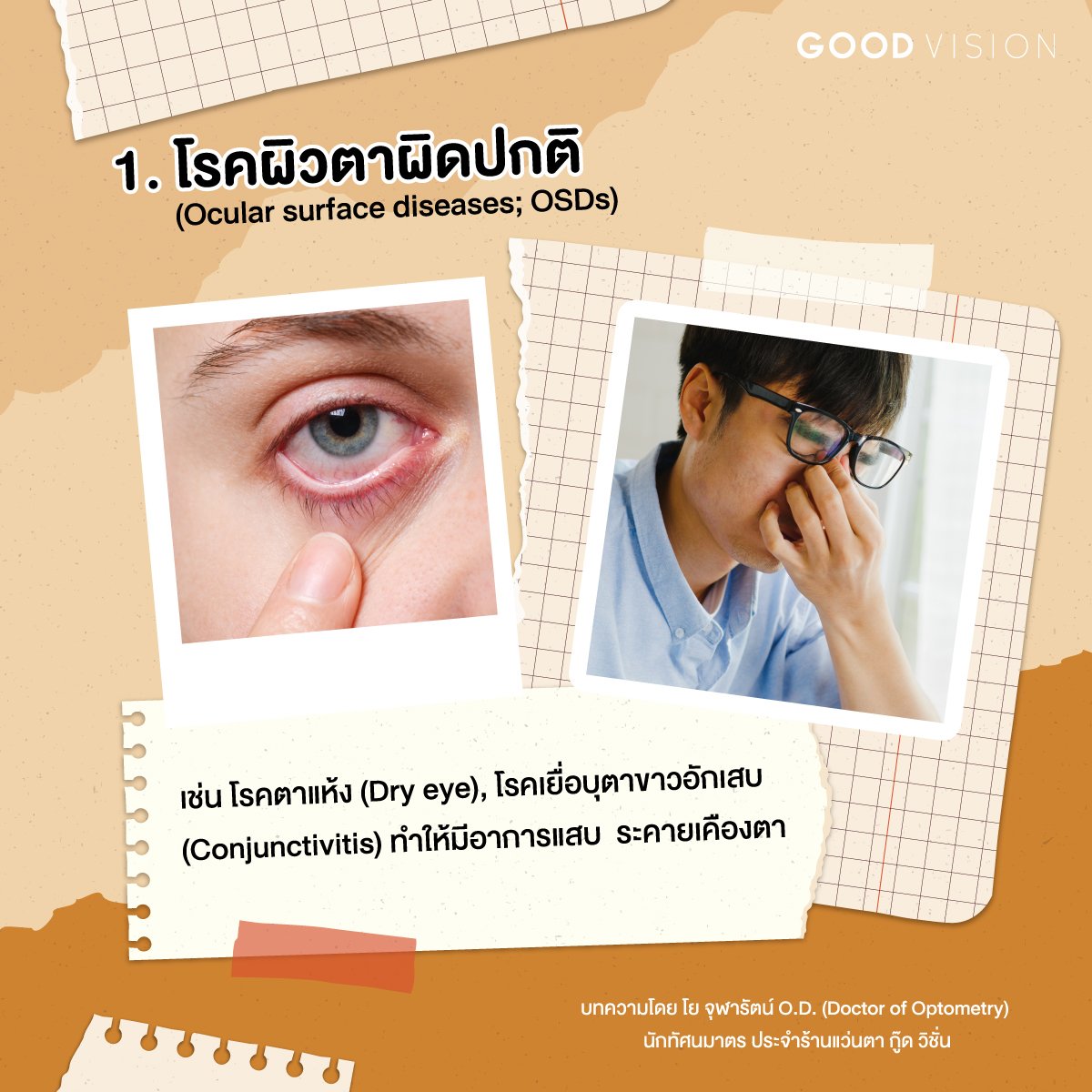 1.โรคผิวตาผิดปกติ (Ocular surface diseases; OSDs) เช่น โรคตาแห้ง (Dry eye), โรคเยื่อบุตาขาวอักเสบ (Conjunctivitis) ทำให้มีอาการแสบ ระคายเคืองตา