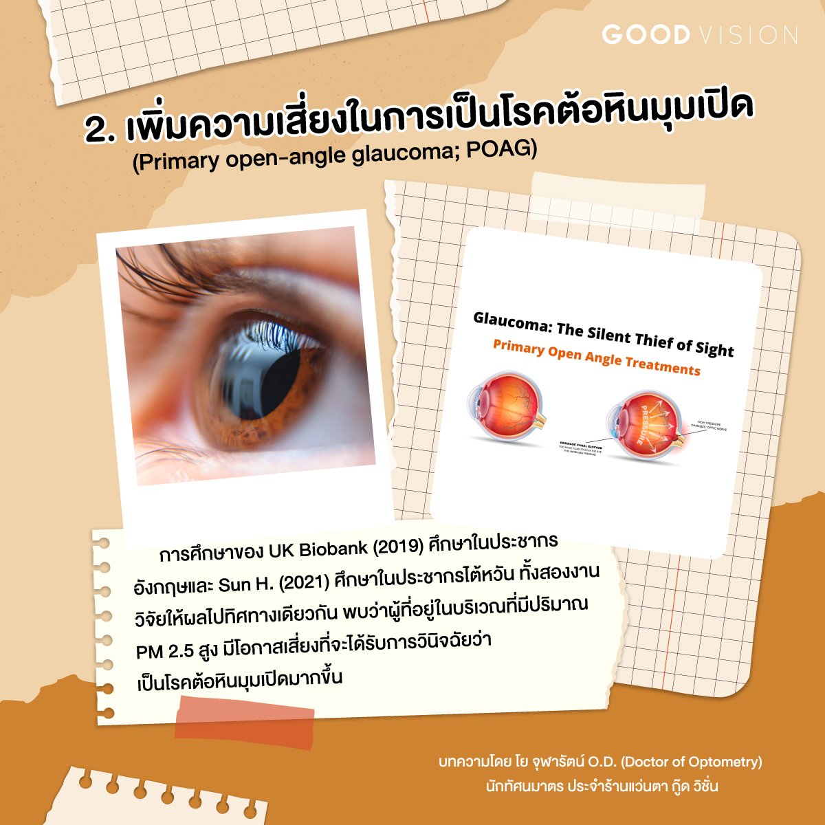 การศึกษาของ UK Biobank (2019) ศึกษาในประชากรอังกฤษ และ Sun H. (2021) ศึกษาในประชากรไต้หวัน ทั้งสองงานวิจัยให้ผลไปทิศทางเดียวกัน พบว่าผู้ที่อยู่ในบริเวณที่มีปริมาณ PM 2.5 สูง มีโอกาสเสี่ยงที่จะได้รับการวินิจฉัยว่าเป็นโรคต้อหินมุมเปิดมากขึ้น