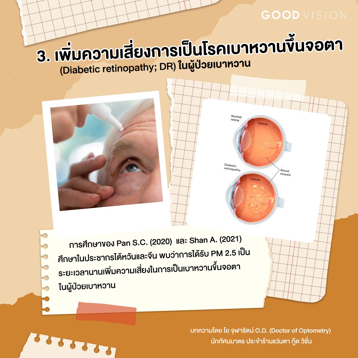 3. เพิ่มความเสี่ยงการเป็นโรคเบาหวานขึ้นจอตา (Diabetic retinopathy; DR) ในผู้ป่วยเบาหวาน การศึกษาของ Pan S.C. (2020) และ Shan A. (2021) ศึกษาในประชากรไต้หวันและจีน พบว่าการได้รับ PM 2.5 เป็นระยะเวลานานเพิ่มความเสี่ยงในการเป็นเบาหวานขึ้นจอตาในผู้ป่วยเบาหวาน