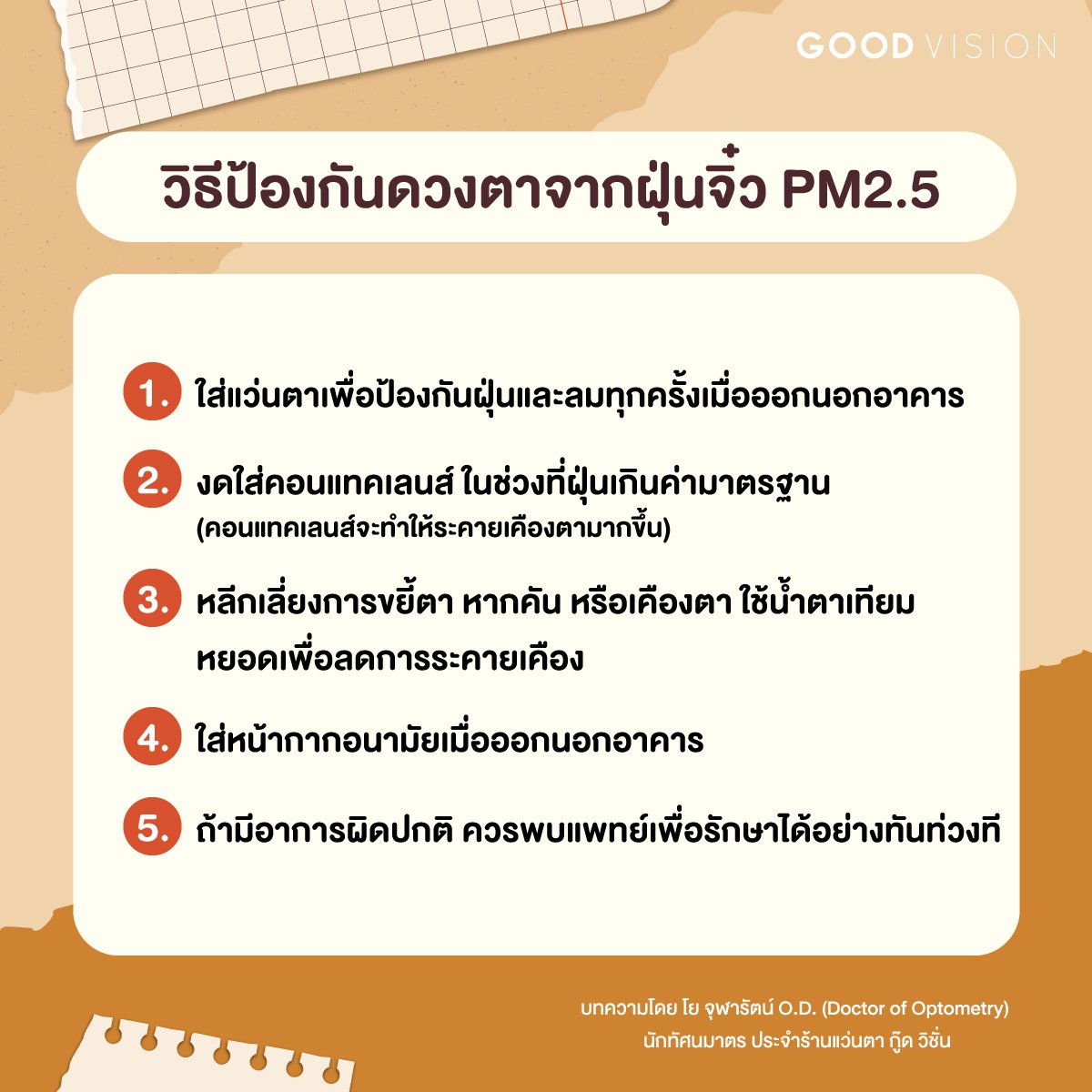 2. งดใส่คอนแทคเลนส์ ในช่วงที่ฝุ่นเกินค่ามาตรฐาน (คอนแทคเลนส์จะทำให้ระคายเคืองตามากขึ้น)
