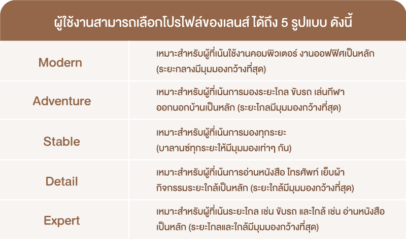 Adventure ; เหมาะสำหรับผู้ที่เน้นการมองระยะไกล ขับรถ เล่นกีฬา ออกนอกบ้านเป็นหลัก (ระยะไกลมีมุมมองกว้างที่สุด)