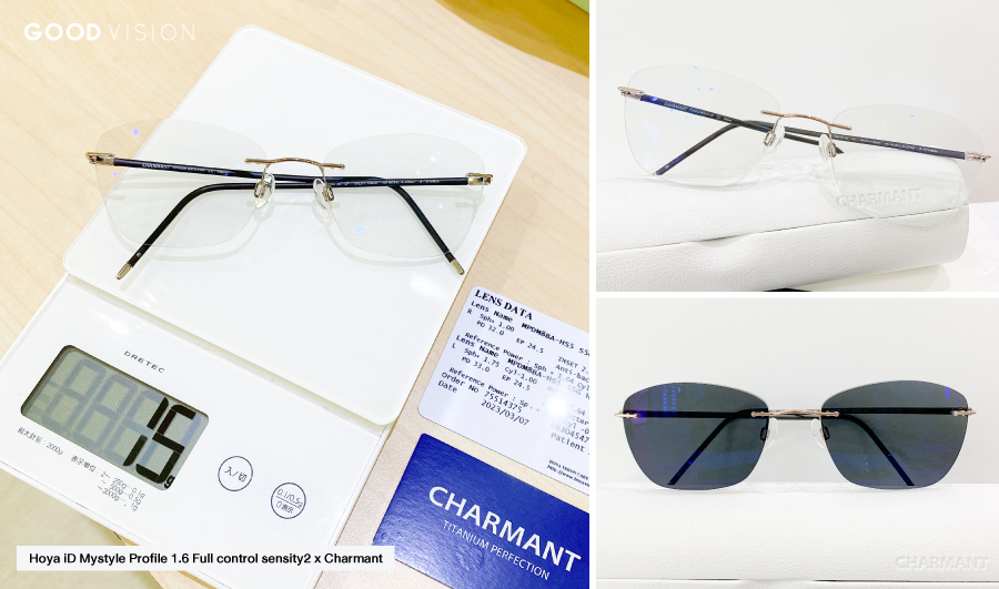 ลูกค้าเลือกกรอบเจาะ/ไร้ขอบ Charmant Titanium Perfection รุ่น CH16714E แบรนด์จากประเทศญี่ปุ่น วัสดุขาเป็น pure titanium คุณภาพสูง หุ้มด้วยพลาสติกเพื่อให้ไม่ระคายเคือง เหมาะสำหรับผู้ที่แพ้โลหะ และยังมีน้ำหนักเบา เมื่อรวมเลนส์แล้วน้ำหนักเพียง 15 กรัม มั่นใจได้ว่าลูกค้าสามารถใส่ได้อย่างสบายตลอดทั้งวัน