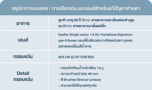 สำหรับเคสนี้ ลูกค้ามีภาวะสายตายาวและเอียงค่อนข้างสูง แนะนำเป็นเลนส์ Essilor Single vision 1.6 Rx Transitions Signature gen 8 Brown เลนส์ชั้นเดียวย่อบางขัดแลปเฉพาะบุคคลออกแดดเปลี่ยนสีน้ำตาล