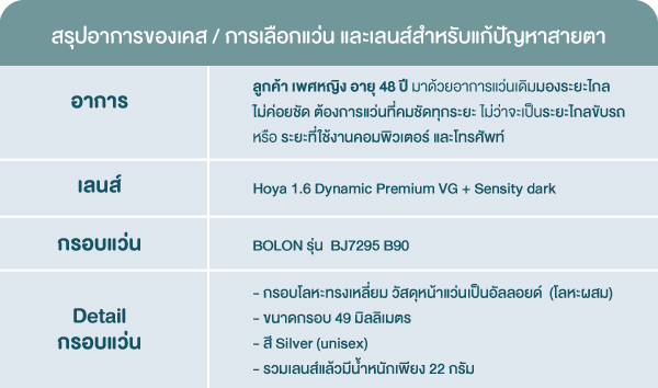 ลูกค้า เพศหญิง อายุ 48 ปี มาด้วยอาการแว่นเดิมมองระยะไกลไม่ค่อยชัด ต้องการแว่นที่คมชัดทุกระยะไม่ว่าจะเป็นระยะไกลขับรถ หรือระยะที่ใช้งานคอมพิวเตอร์ และโทรศัพท์