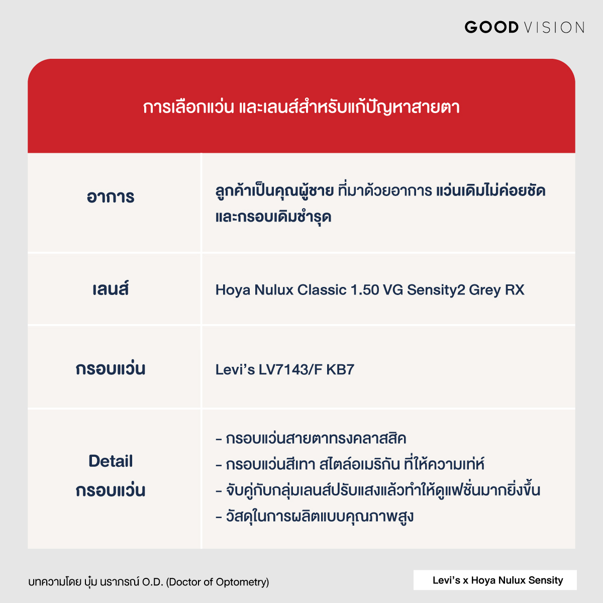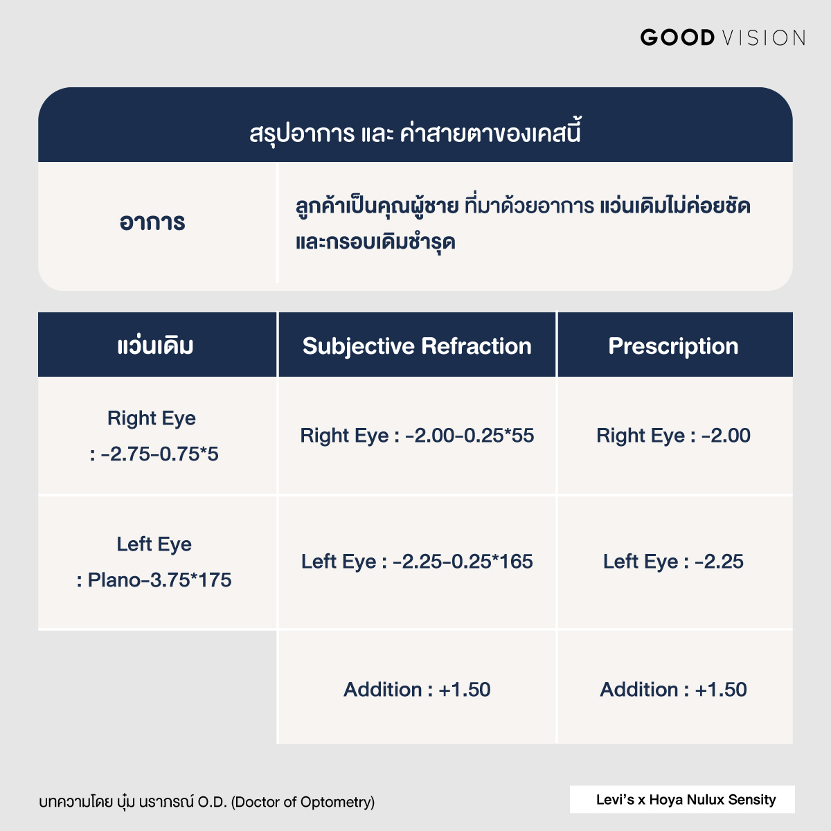 จะเห็นได้ว่าค่าสายตาของลูกค้าไม่ได้เปลี่ยนแปลงมากนัก แต่ปัญหาทที่ทำให้แว่นเดิมไม่ชัดสาเหตุน่าจะเกิดจากเลนส์เดิมผิวโค้ทเสื่อม ทำให้การหักเหแสงไม่คมชัดเหมือนเดิม และด้วยอาชีพของลูกค้าที่ต้องเจอแสงแดดค่อนข้างเยอะ ยิ่งทำให้การมองเห็นไม่ค่อยสบายตา ทางร้านจึงแนะนำใช้กลุ่มเลนส์