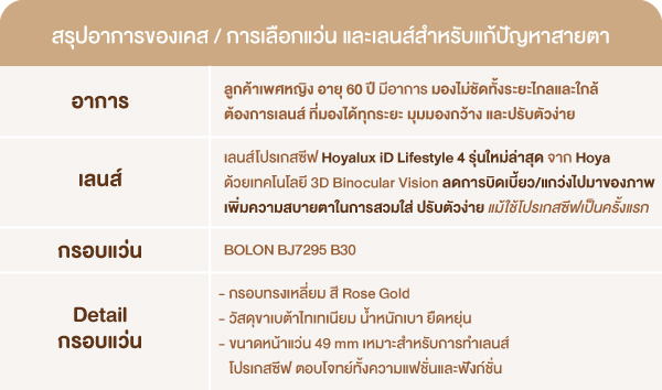 ลูกค้าเพศหญิง อายุ 60 ปี มีอาการมองไม่ชัดทั้งระยะไกลและใกล้ ต้องการเลนส์ที่มองได้ทุกระยะ มุมมองกว้าง และปรับตัวง่าย จึงเข้ามาปรึกษาและตรวจสายตากับทางร้าน