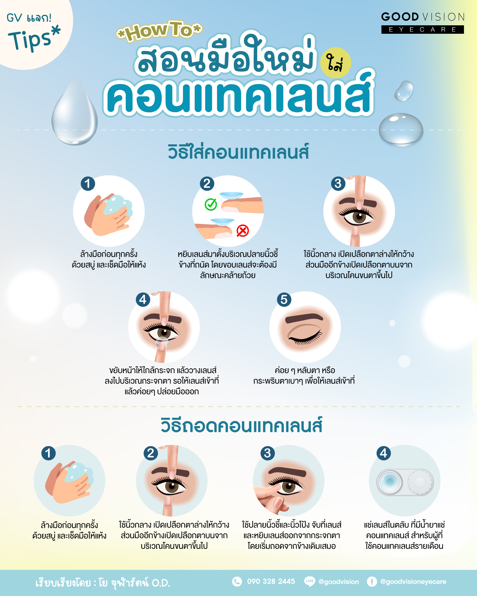วันนี้ ร้านแว่นตากู๊ดวิชั่น มีวิธีใส่คอนแทคเลนส์ และ วิธีถอดคอนแทคเลนส์ ที่ถูกต้อง มาฝากทุกคนกันค่ะ เทคนิคนี้จะช่วยให้สามารถใช้คอนแทคเลนส์ได้อย่างมั่นใจ สบายตาทุกครั้งที่สวมใส่ แน่นอนค่ะ