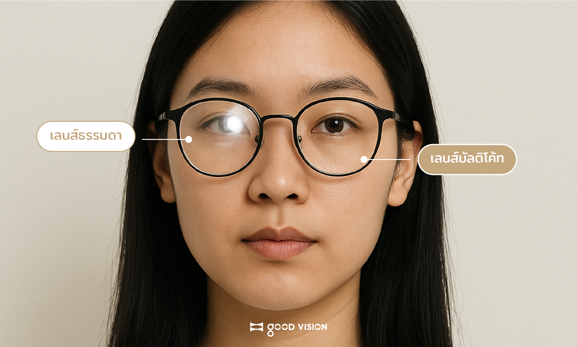 1. เลนส์มัลติโค้ท (Anti-Reflective/Multi-Coating Lenses) เลนส์ใสเคลือบผิวเพื่อตัดแสงสะท้อนบนผิวเลนส์ทำให้ภาพใส คมชัด ป้องกันรอยขีดข่วนบนผิวเลนส์ ผิวเลนส์ลื่น เช็ดทำความสะอาดง่าย เหมาะกับผู้มีปัญหาสายตาทั่วไป เน้นใส่แว่นสายตาเพื่อให้ภาพคมชัดขึ้นเท่านั้น