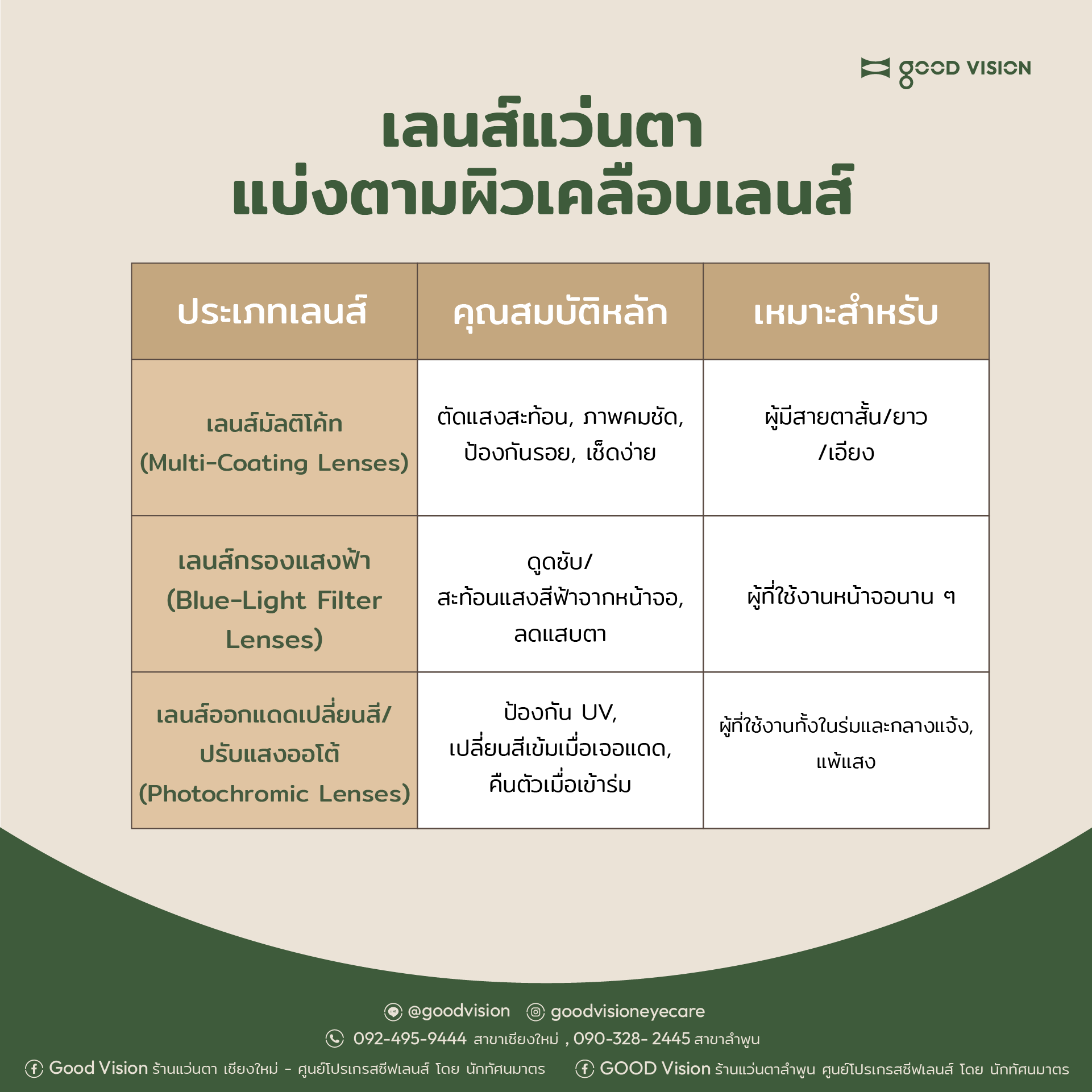ตารางสรุปการแบ่งชนิดของเลนส์ตามผิวเคลือบเลนส์