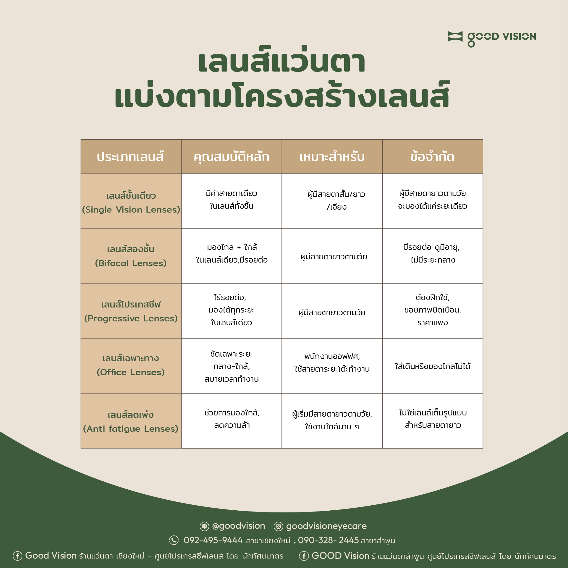 วันนี้ GOOD VISION ได้รวบรวมเลนส์ของแต่ละชนิดมาให้ เพื่อให้ท่านที่มีปัญหาสายตาได้เลือกใช้เลนส์ที่ ‘ใช่’