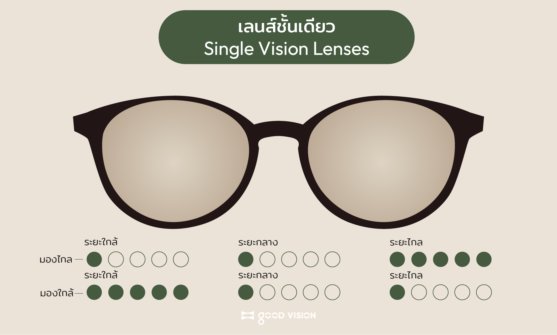 1. เลนส์ชั้นเดียว (Single Vision Lenses) เลนส์ที่มีค่าสายตาเดียวกันในเลนส์ทั้งชิ้น เหมาะกับผู้ที่มีปัญหาสายตาสั้น ยาว เอียง สำหรับผู้มีอายุยังไม่ถึง 40 ปี หรือยังไม่มีปัญหาสายตายาวตามวัย สามารถใส่เลนส์ชนิดนี้มองได้ชัดทุกระยะ แต่ผู้ที่มีสายตายาวตามวัย ถ้าใช้เลนส์ชั้นเดียวจะมองได้เพียงระยะโฟกัสเดียว ผู้ใช้งานต้องเลือกว่าจะใช้เลนส์นี้ในมองไกลขับรถ หรือมองใกล้อ่านหนังสือ