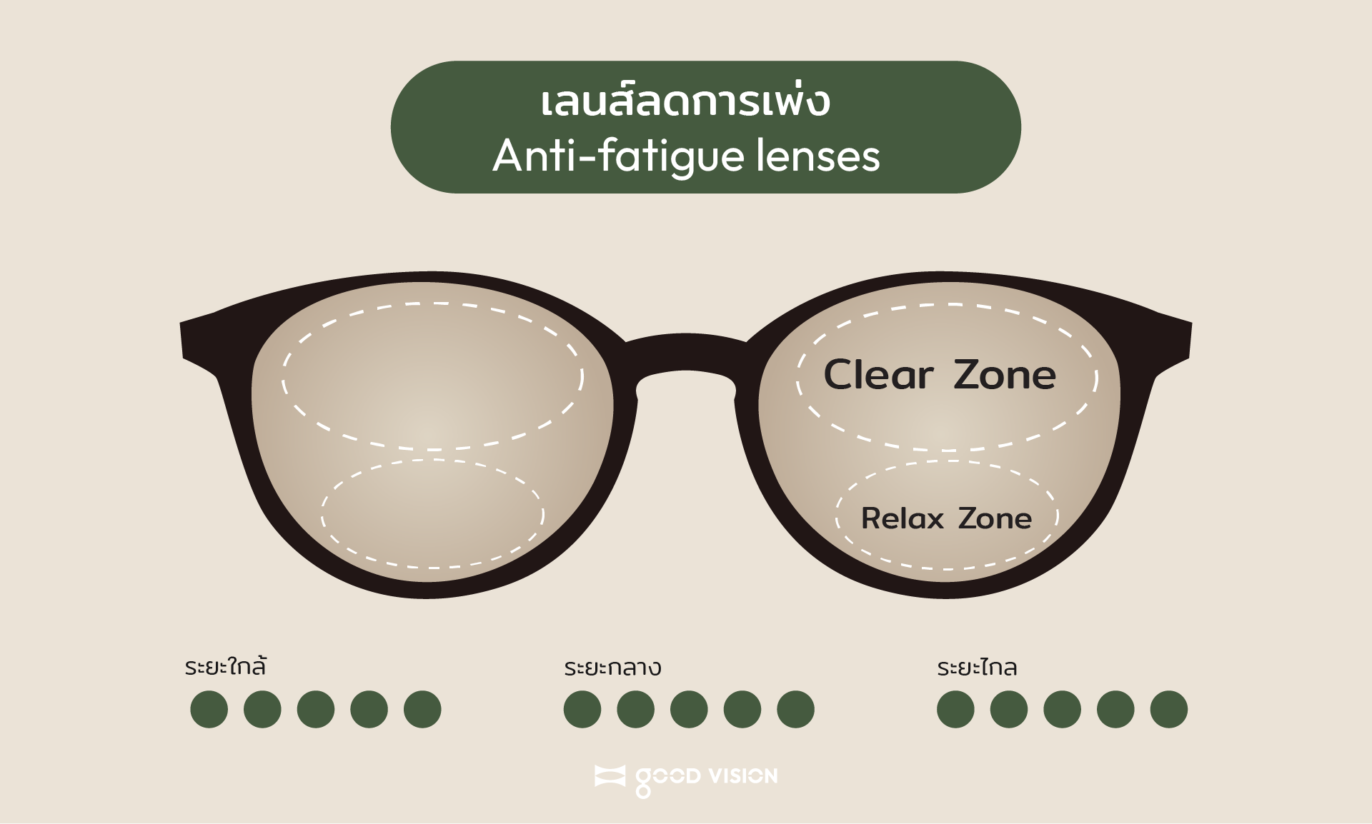 5. เลนส์ลดการเพ่ง/ลดการเมื่อยล้าตา (Anti-fatigue lenses) เลนส์ที่ออกแบบขอบล่างของเลนส์ ไว้สำหรับการมองระยะใกล้โดยเฉพาะ ช่วยลดอาการเมื่อยล้าตา ในผู้ที่ใช้สายตาในระยะใกล้เป็นเวลานาน เหมาะกับผู้ที่ใช้สายตาระยะใกล้เป็นเวลานาน ผู้ที่เริ่มมีสายตายาวตามวัยน้อย ๆ