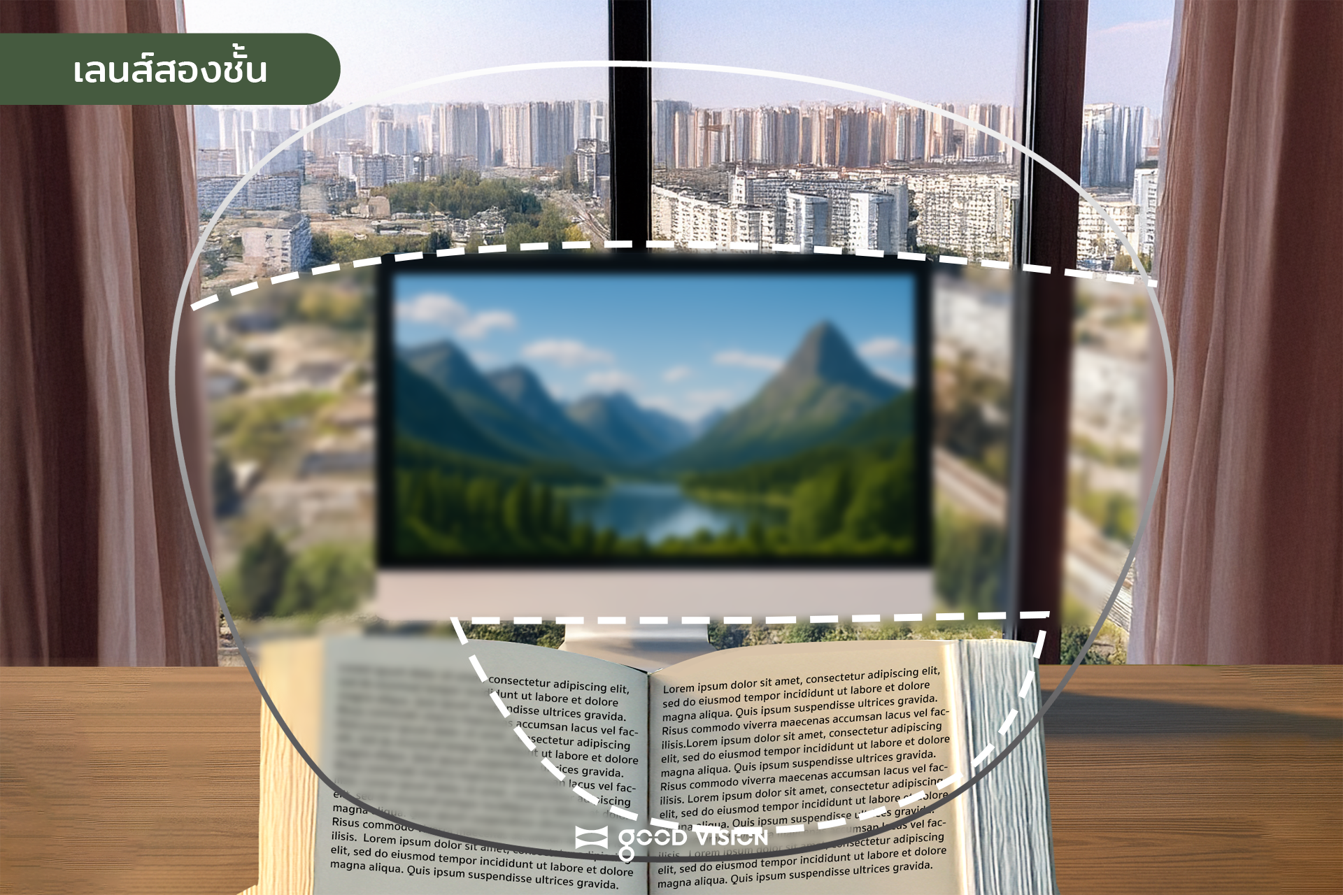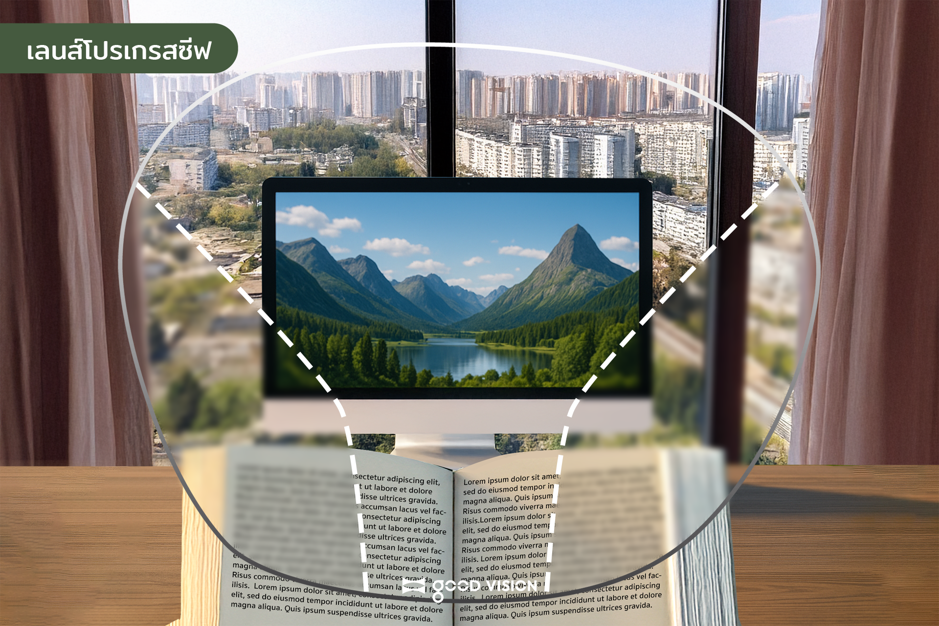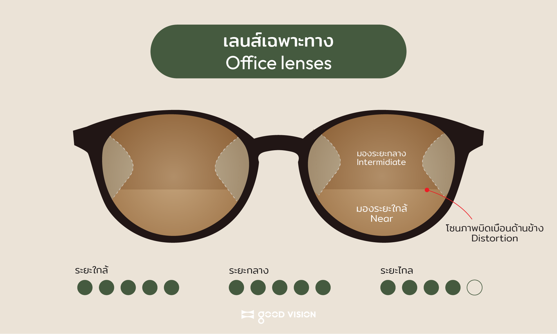 4. เลนส์เฉพาะทาง/เลนส์ออฟฟิศ (Office lenses) เลนส์สายตายาวตามวัย ออกแบบมาเพื่อใช้ในการมองระยะกลาง-ใกล้ (40 ซม - 2 เมตร) เหมาะกับพนักงานออฟฟิศที่มีปัญหาสายตายาวตามวัย หรือผู้ที่ใช้สายตาระยะกลาง-ใกล้เป็นหลัก
