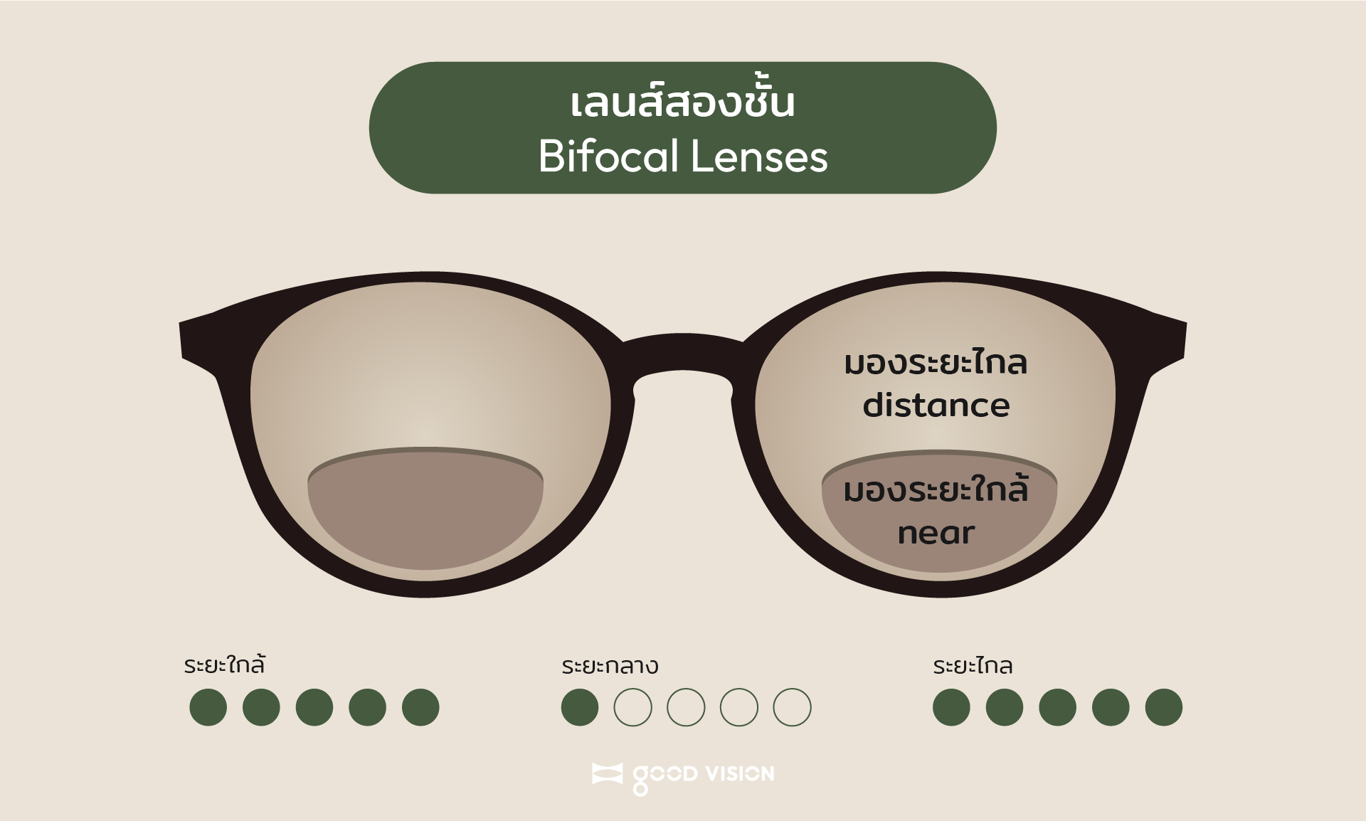 2. เลนส์สองชั้นแบบมีรอยต่อ (Bifocal Lenses) เลนส์มี 2 ค่าสายตาในเลนส์ชิ้นเดียว เหมาะกับผู้ที่มีปัญหาสายตายาวตามวัย โดยโซนด้านบนของเลนส์ ใช้สำหรับการมองระยะไกล (ระยะ 3 เมตรขึ้นไป) ส่วนด้านล่างจะมีลักษณะคล้ายถ้วยนูนขึ้นมา เป็นโซนสำหรับการมองระยะใกล้ (ระยะโฟกัสอยู่ที่ประมาณ 40 ซม - 60 ซม)