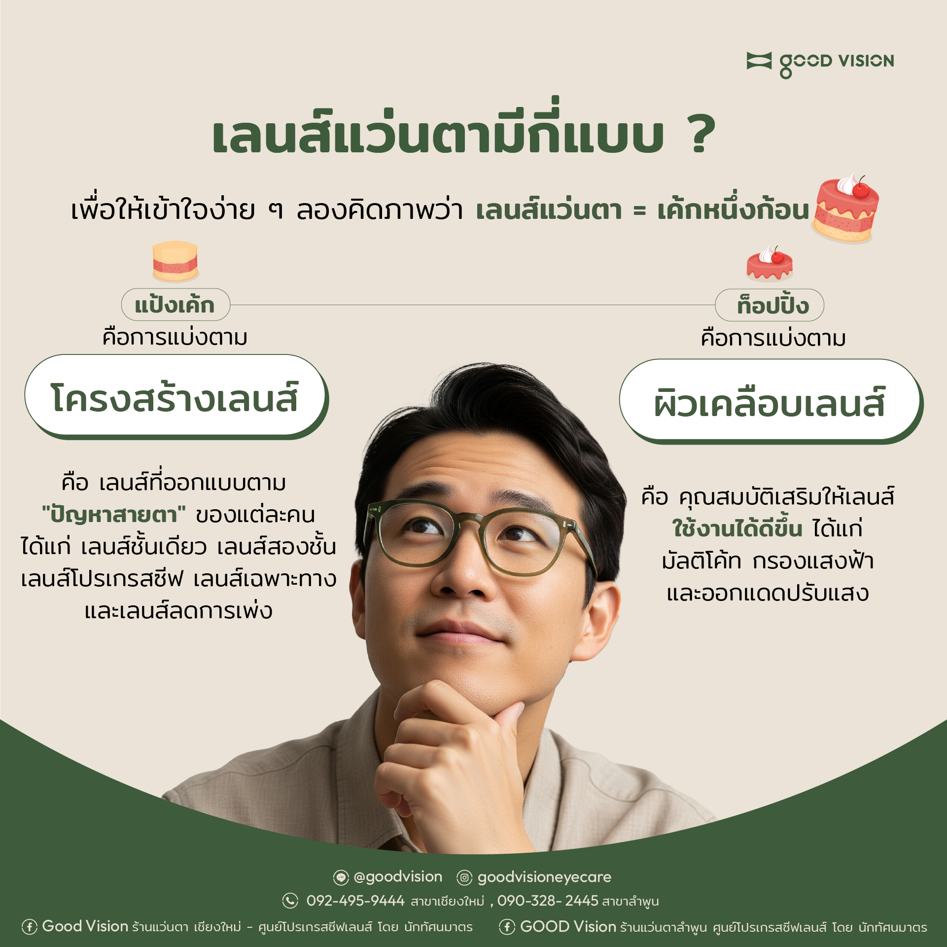 ชนิดของเลนส์สามารถแบ่งได้ 2 แบบ คือ การแบ่งตามโครงสร้างเลนส์ และ การแบ่งตามผิวเคลือบเลนส์ เพื่อให้เข้าใจได้ง่ายขึ้น เราจะเปรียบเทียบเลนส์แว่นตา คือ เค้กหนึ่งก้อน ในส่วนของแป้งเค้ก เปรียบได้เป็นโครงสร้างเลนส์ และส่วนของท็อปปิ้ง เปรียบเป็นผิวเคลือบเลนส์