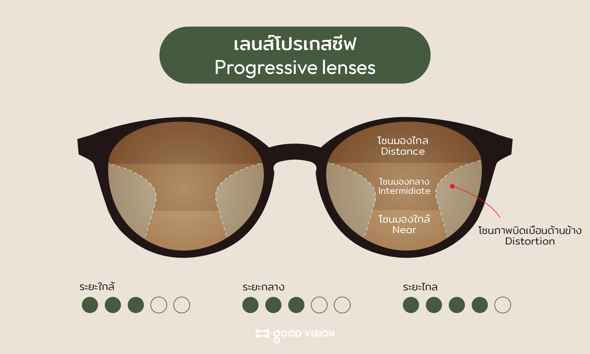 3. เลนส์โปรเกสซีฟ (Progressive lenses) เลนส์มีครบทุกโฟกัสการมองในเลนส์ชิ้นเดียว ไร้รอยต่อ มองเห็นชัดเจนทุกระยะ เหมาะสำหรับผู้มีปัญหาสายตายาวตามวัย โดยเลนส์จะไล่โฟกัสค่าสายตาการมองระยะไกล มาจนถึง ระยะใกล้ (ตั้งแต่ด้านบน-ด้านล่าง)