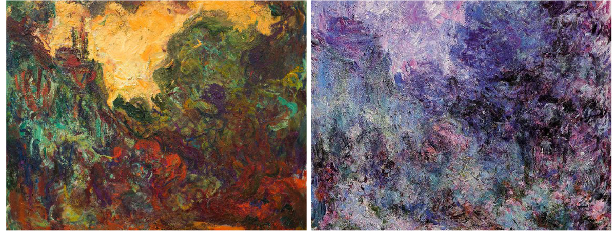 ภาพวาดของโมเนต์เริ่มเปลี่ยนไป แม้จะเป็นภาพวาดที่สถานที่เดิม ภาพซ้าย เป็นภาพที่โมเนต์วาดในช่วงที่การมองเห็นปกติ ฝีแปรงมีความเล็ก และลงรายละเอียด สีของภาพเหมือนต้นไม้จริงตามธรรมชาติ ภาพขวา เป็นช่วงที่ต้อกระจกของโมเนต์รุนแรงขึ้น โทนสีผิดเพี้ยนไปจากความจริง ฝีแปรงฟุ้ง ขอบเบลอจนแทบมองไม่เห็นรายละเอียด