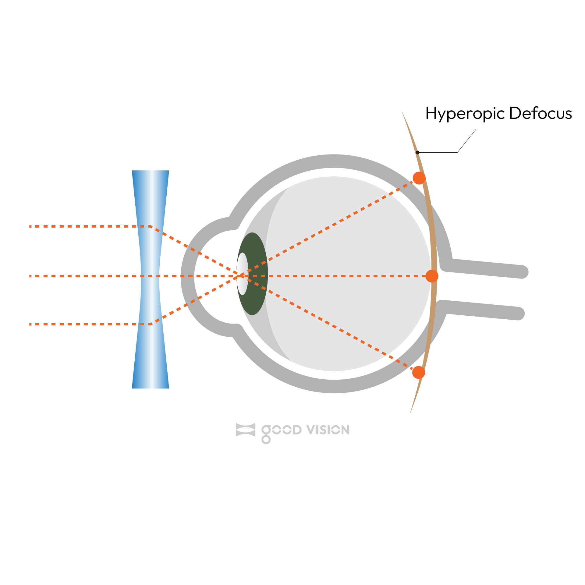 หลักการทำงานของเลนส์สายตาสั้นทั่วไป คือ แสงผ่านบริเวณกึ่งกลางเลนส์ หักเหไปตกบริเวณจอรับภาพ ทำให้การมองเห็นคมชัดขึ้น แต่แสงที่ผ่านบริเวณขอบเลนส์จะหักเหเลยจอรับภาพไป (Hyperopic Peripheral Defocus) ดวงตาของเด็กจึงตอบสนองด้วยการขยายความยาวของกระบอกตา เพื่อไปรับแสงที่ตกไม่ตรงบริเวณจอรับภาพ ทำให้เด็กสายตาสั้นเพิ่มขึ้น กล่าวได้ว่า เลนส์ช่วยให้เด็กมองเห็นชัดขึ้น แต่ก็จะทำให้สายตาสั้นเพิ่มขึ้นได้
