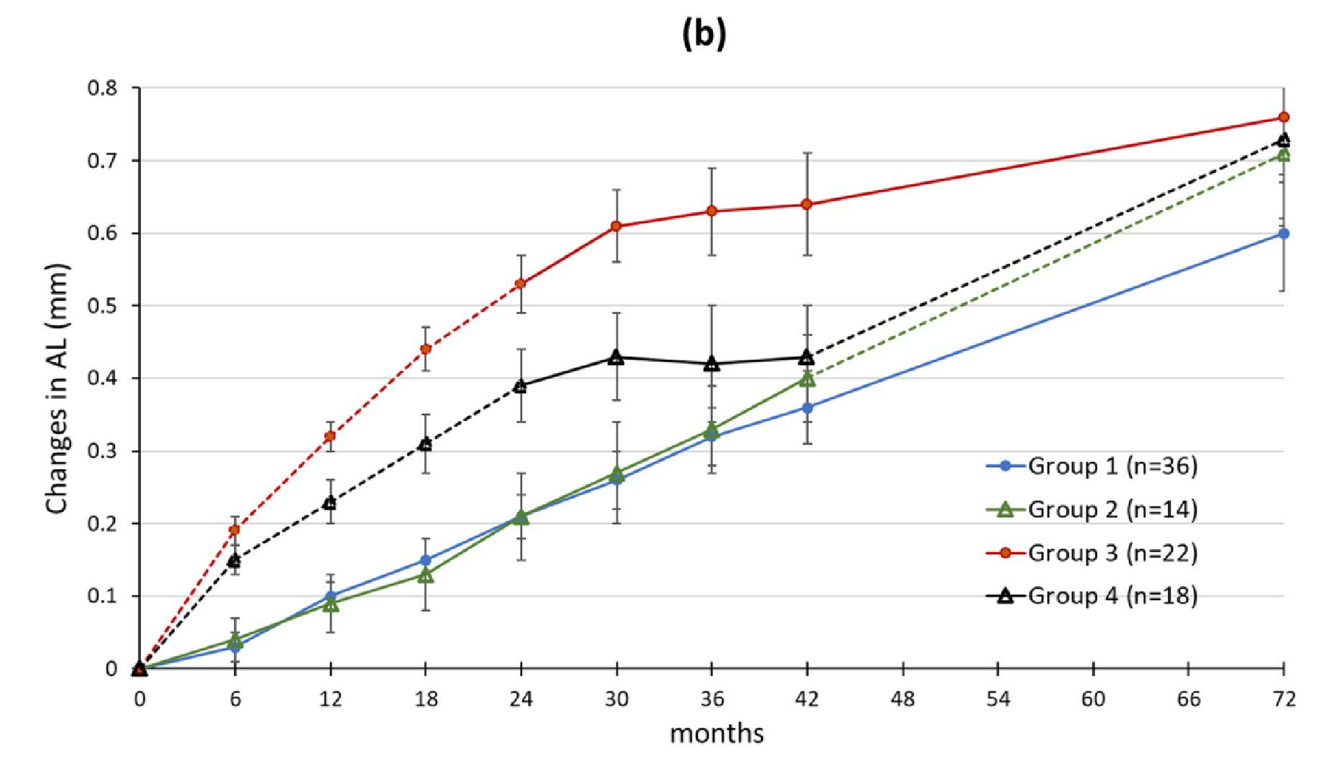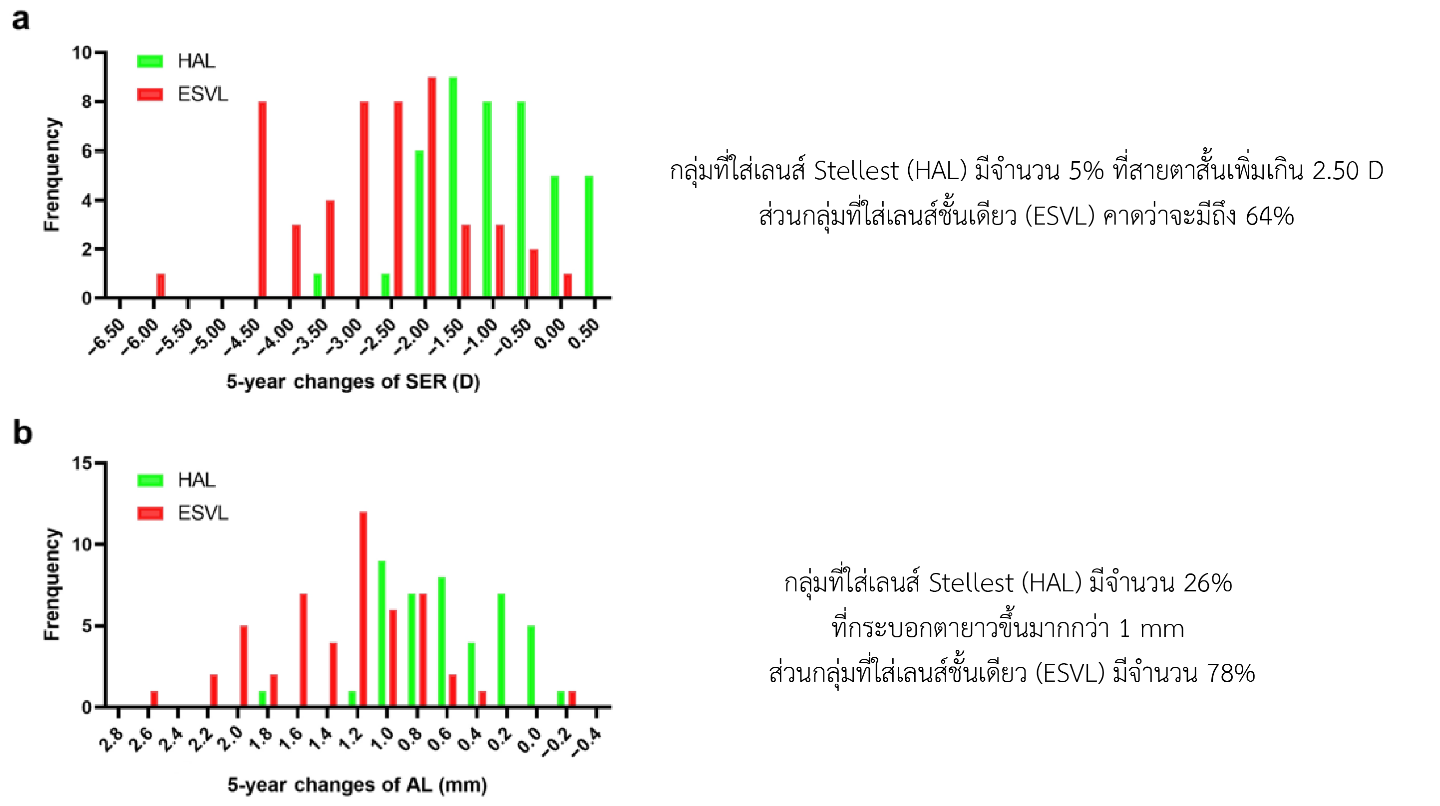 กราฟแสดงการเพิ่มขึ้นของค่าสายตาสั้น (a) และการเพิ่มขึ้นของความยาวกระบอกตา (b) เส้นสีเขียว หมายถึงกลุ่มที่ใส่เลนส์ Stellest เส้นสีแดง หมายถึงกลุ่มที่ใส่เลนส์สายตาชั้นเดียว