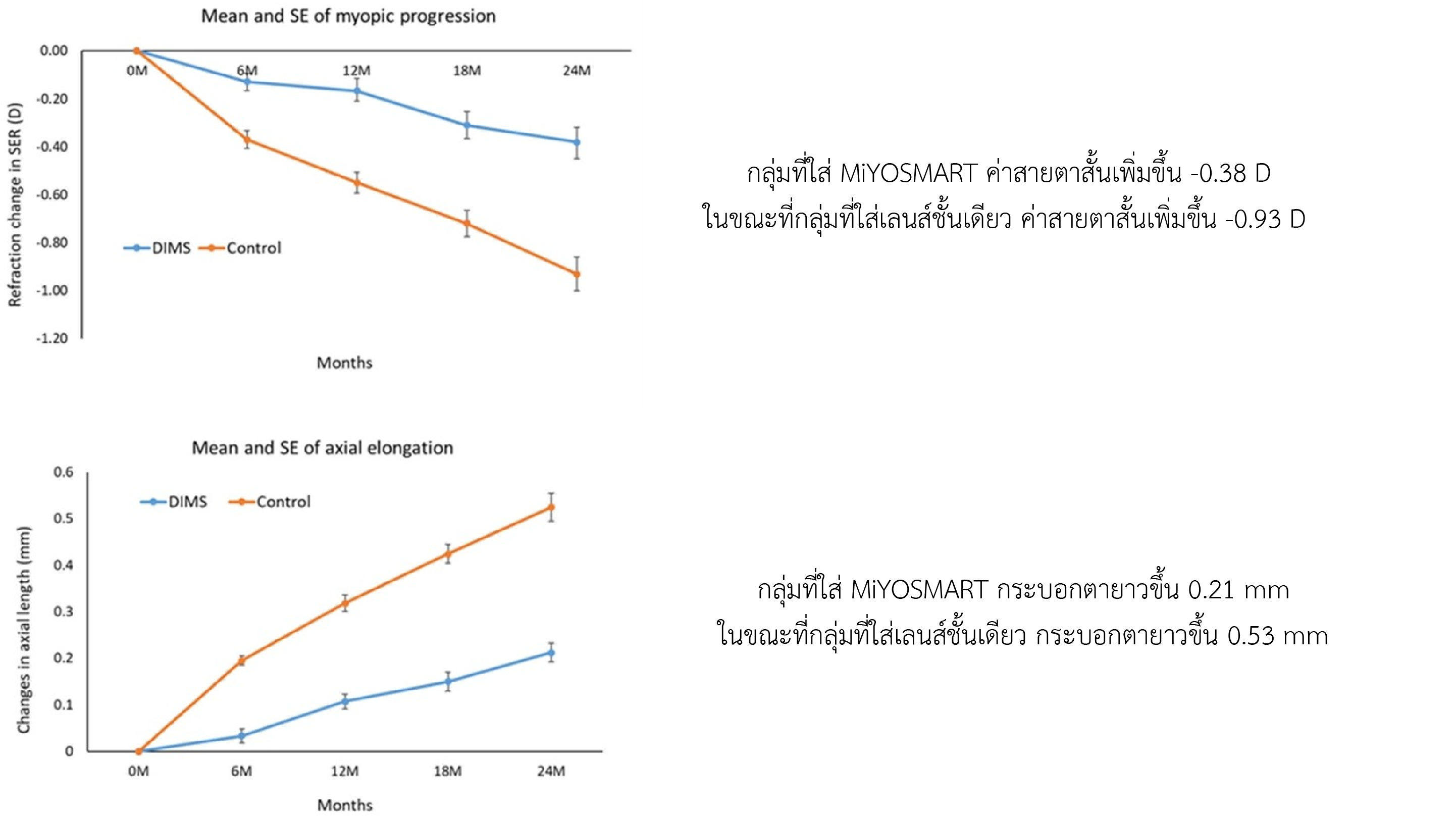 เลนส์ MiYOSMART สามารถลดการเพิ่มขึ้นของค่าสายตาสั้นได้ 52% และ ลดการยาวขึ้นของกระบอกตา 62% เมื่อเทียบกับ กลุ่มที่ใส่เลนส์สายตาชั้นเดียว