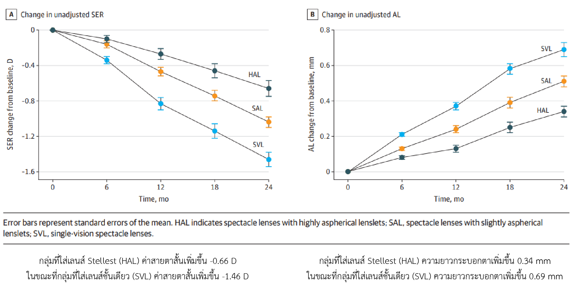 เด็กที่ใส่เลนส์ Stellest เป็นระยะเวลาต่อเนื่อง 5 ปี มีการเพิ่มขึ้นของสายตาสั้น -1.27 D และกระบอกตายาวขึ้น 0.67 mm