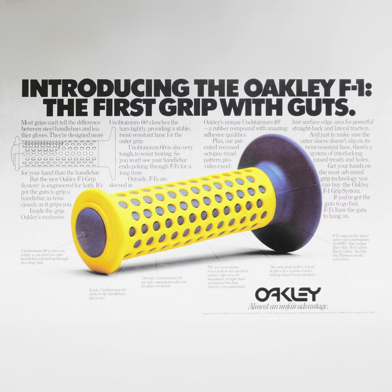 ในปี 1975 OAKLEY ได้เปิดตัว Oakley Grip ปลอกแฮนด์มอเตอร์ไซค์ ผิวสัมผัสคล้ายหนวดปลาหมึก ช่วยเพิ่มแรงยึดเกาะ ผลิตจากยางพิเศษ โดยยิ่งเหนียวและหนึบขึ้นเมื่อโดนเหงื่อ จดสิทธิบัตรภายใต้ชื่อ “Unobtainium”