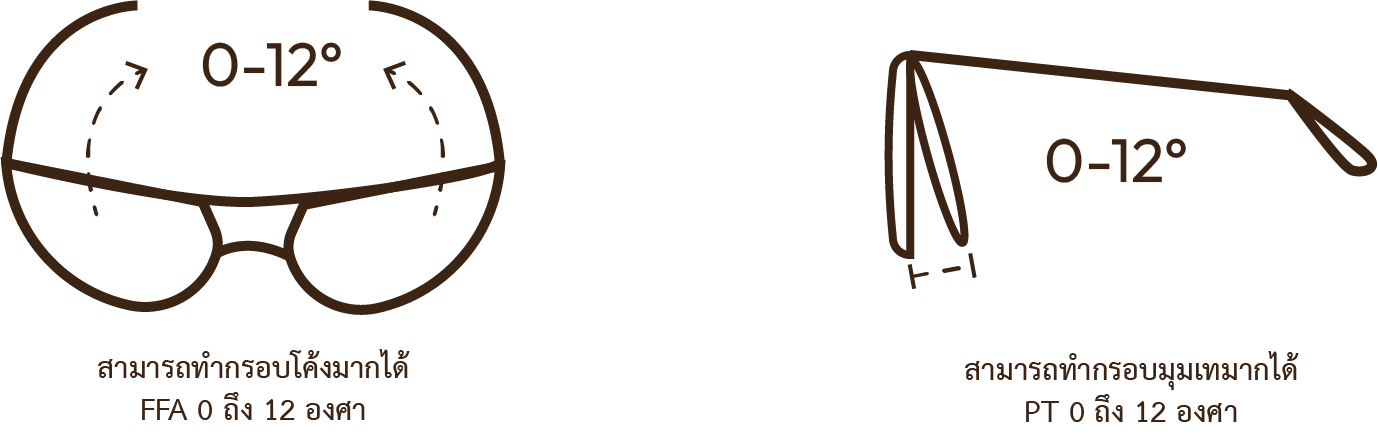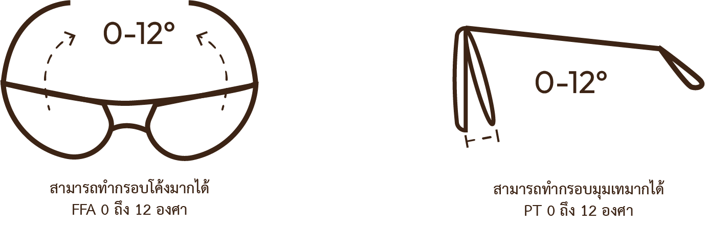 รองรับกรอบแว่นพิเศษ : สามารถใช้กับกรอบที่มีความโค้งและมุมเทมาก (มุมเทแว่น PT 0-12 องศา และความโค้งกรอบ FFA 0-12 องศา)